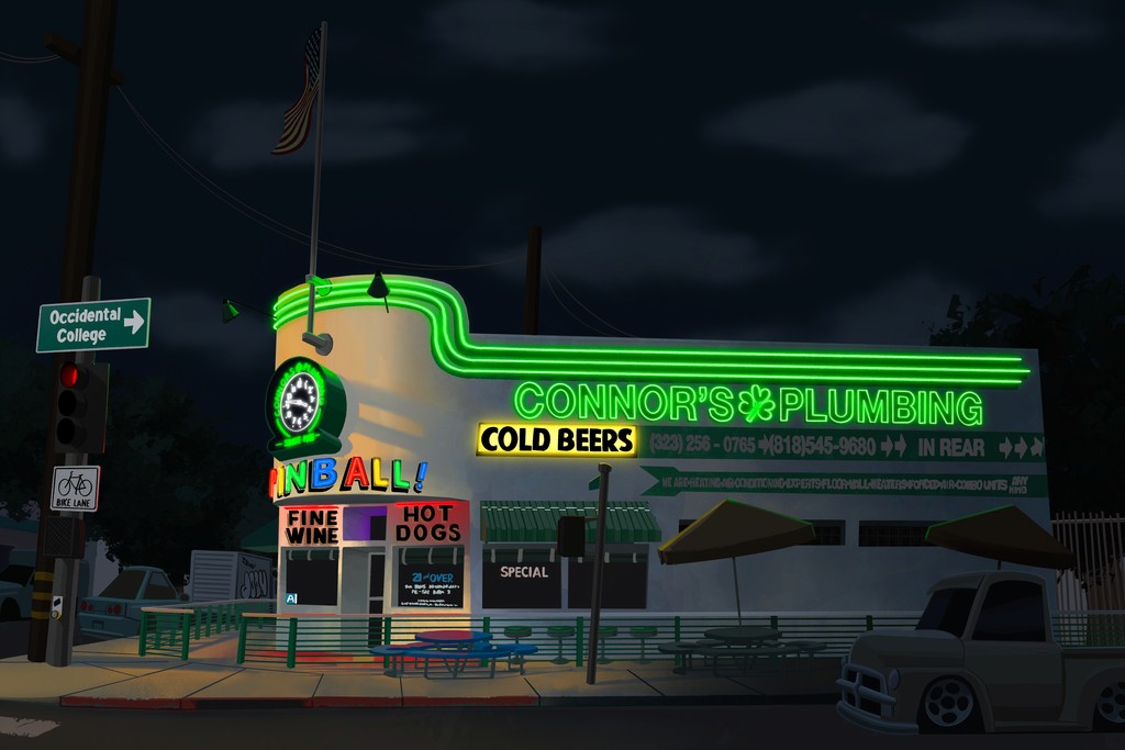 A day and night painting of Walt's in Eagle Rock